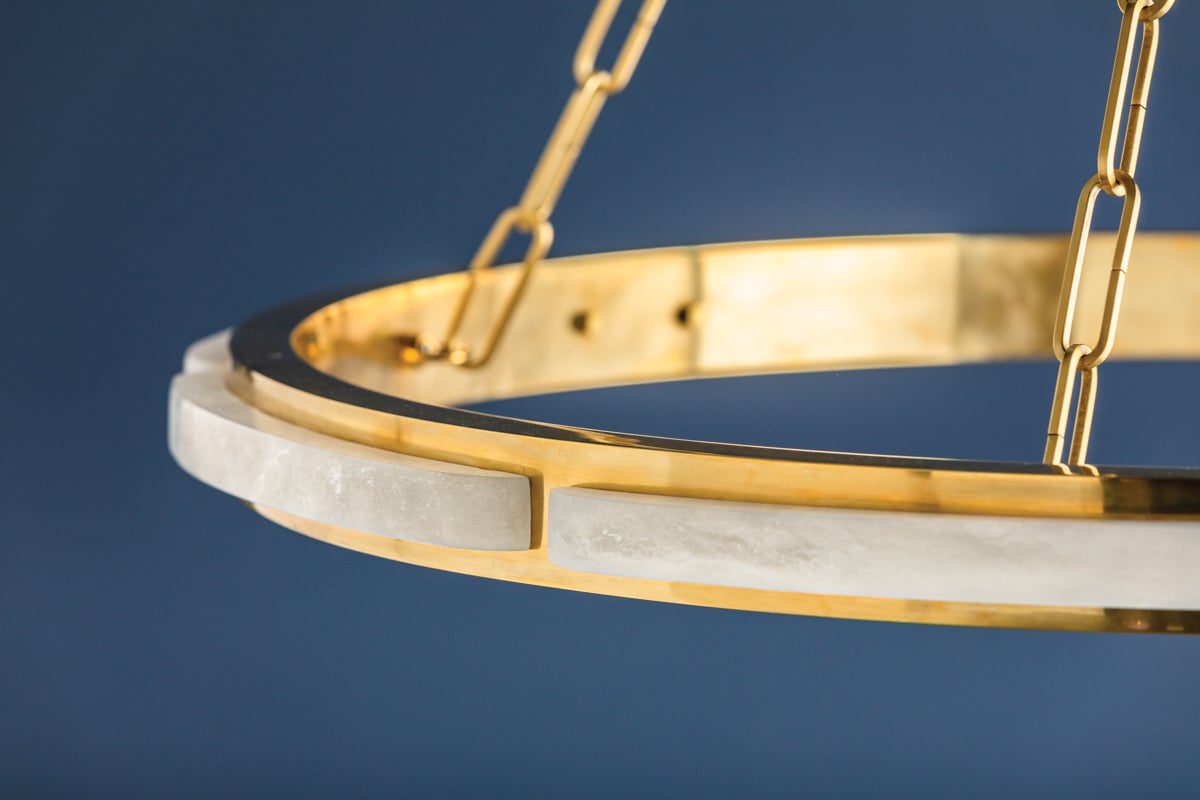 Sophisticated and serene, Wingate features a large Aged Brass ring adorned with alabaster. The concealed LED radiates a bright glow, illuminating the alabaster and reflecting off the brass. Marrying the organicism of the stone with the distinguished look of the brass strikes a stylish, modern note. Available in two sizes, Wingate hangs as a modern showpiece.