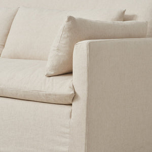 The sink-in feel of this plush sofa will make you never want to leave. Featuring a relaxed, comfortable vibe with a slipcovered frame and knife-edge cushioning. Designed with a deep, higher seat height and big supportive back pillows. Upholstered in cotton/linen blend.